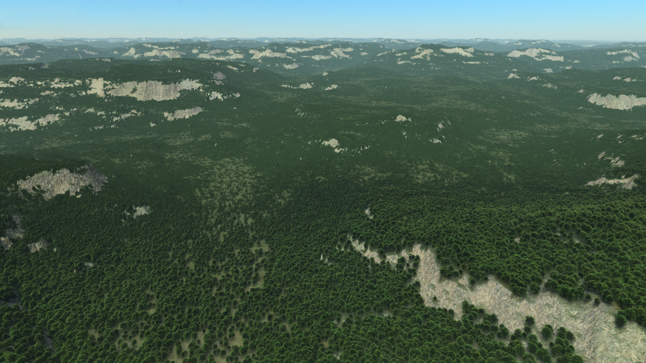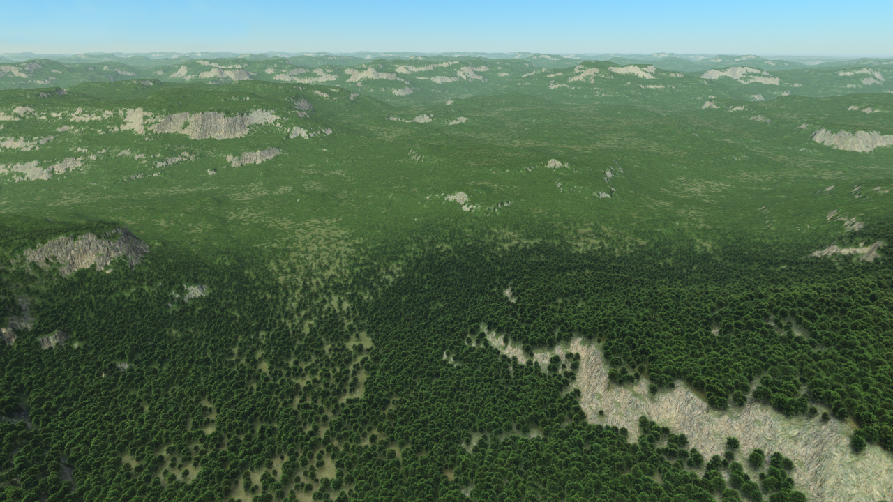 We see color breaks due to the seeding areas allowed for each plant. Consequently, each plant will imprint its colors on the landscape it covers. So the terrain does not need to be designed with plant coloring in mind and specific texturing to handle far away views. Plant coloring comes from biomes.