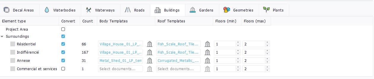 - Roof Templates : One or several Building document(s) to apply as templates on the roof of the buildings of this OSM category.