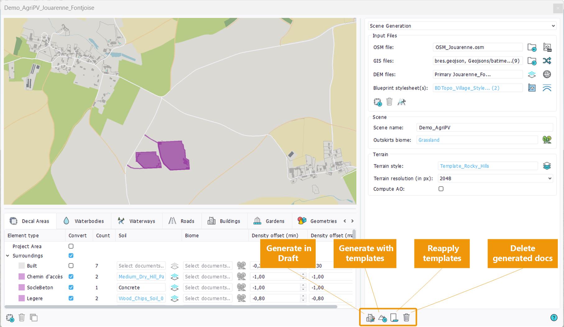 - Generate with templates: generate the 3D scene with templates applied. It takes longer, but the generated scene immediately looks like a real 3D scene and enables you to visualize the templates you have chosen in the blueprint. If you want to edit the generated proposition, we advise that you manually switch some documents (like city and network) to draft mode in the scene tree view before editing them to have the best perfomances.