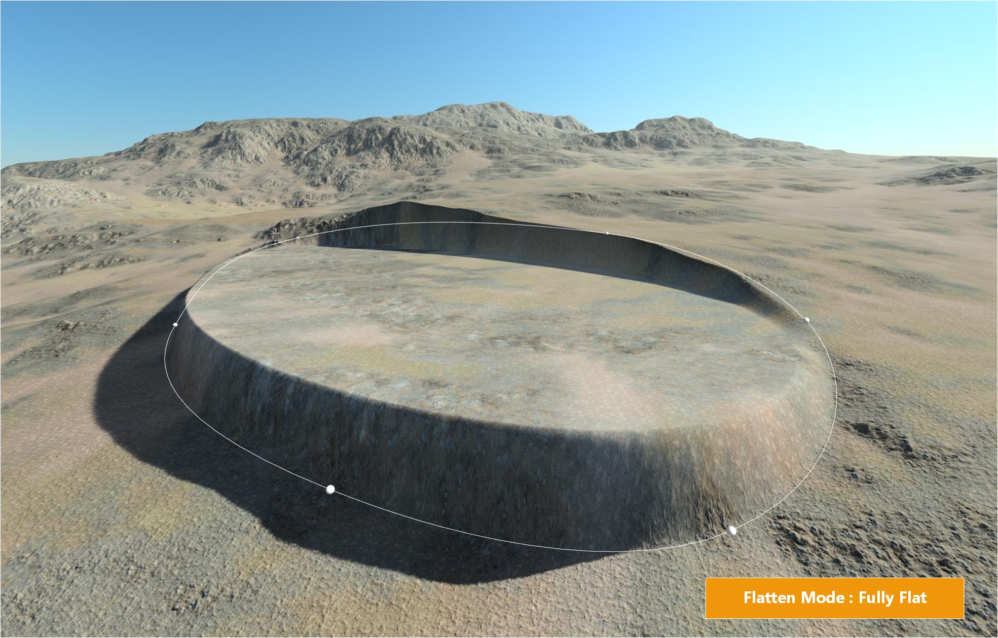 - None : No flattening. This is the default mode, where the decal area does not flatten the terrain, so keeps all relief of the terrain underneath.