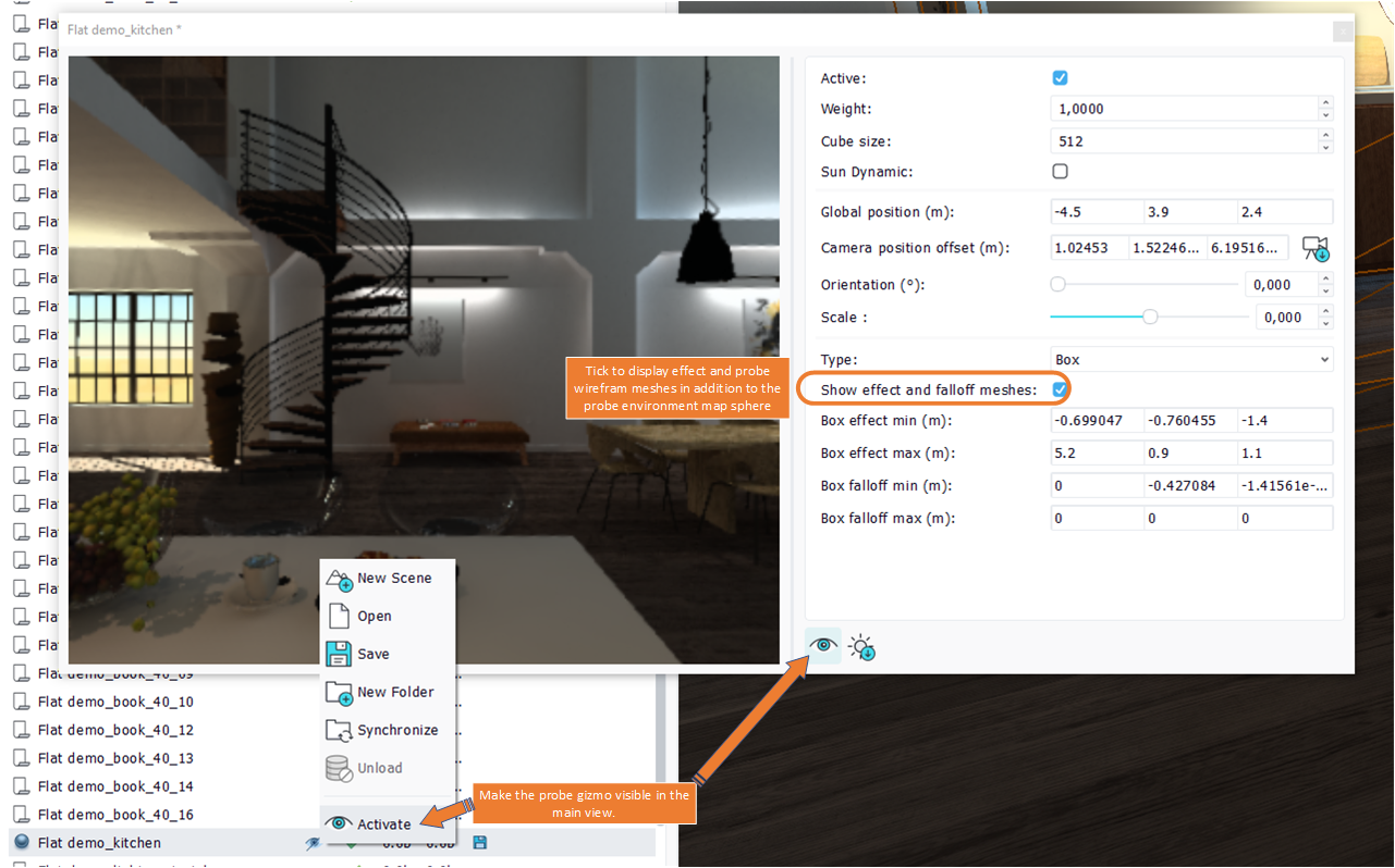 - a camera position offset: defining the point of view when capturing the spherical view of the probe's surroundings.