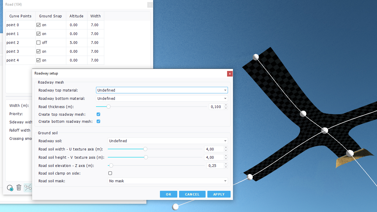 - Auxiliary soil parameters: choice in terms of soil to use aside the road or as a replacement for the soil mesh.