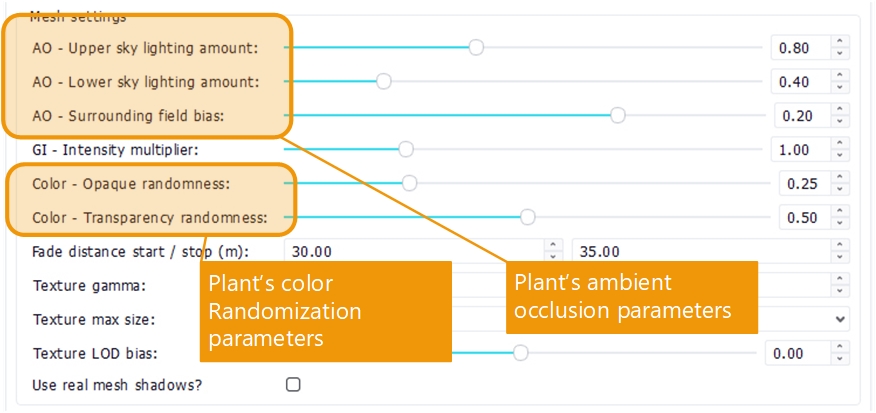 The upper sky lighting amount is the amount of upper light that is considered for the AO calculation (in orange). The same goes for the lower sky lighting amount (in blue). Finally the AO produced on the ground can be biased to appear darker or lighter depending on the average surroundings of that plant (more details below). These parameters are fairly important since NDunes's lighting model uses AO a lot to simulate interactions between a given mesh and its surrounding environment in real-time. Therefore, AO should be representative of the average neighborhood conditions into which this plant is meant to be used. More details on this just below: