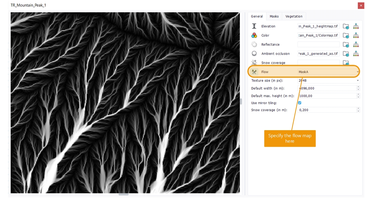 A flow map is setup from the main soil panel, by selecting which mask channel is to be used as flow source: