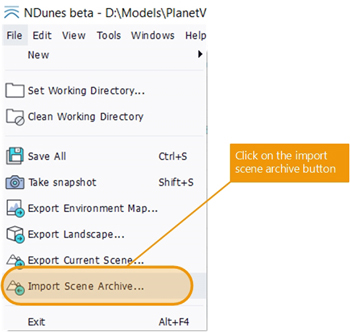 Install by clicking on the "Import scene archive" file menu and by selecting the downloaded zip file. This will unzip the package and set the contents into your current planetary folder.